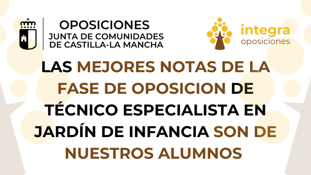 - Técnico Especialista en Jardín de Infancia JCCM: Las mejores notas de la oposición se han preparado con nosotrosHoy se han publicado las calificaciones y la lista de aprobados de la fase de oposición de Técnico Especialista en Jardín de Infancia, y las mejores notas de esta convocatoria corresponden a alumnos y alumnas que se han preparado con Integra Oposiciones. Este éxito es el reflejo de un método de estudio eficaz, una preparación… Lee más: Técnico Especialista en Jardín de Infancia JCCM: Las mejores notas de la oposición se han preparado con nosotros