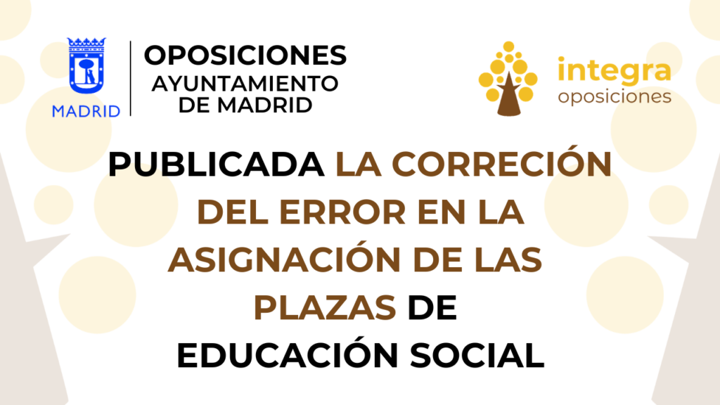 - Educador Social Ayuntamiento de Madrid: Corrección del error de la asignación de las plazasEl Tribunal Calificador de las pruebas selectivas del Ayuntamiento de Madrid, ha publicado la corrección del error en la asignación de las plazas, de Educador Social. Se ha detectado un error material en el anexo de la Resolución de 2 de marzo de 2026 del Director General de Planificación de Recursos Humanos (BOAM núm. 10.079)…. Lee más: Educador Social Ayuntamiento de Madrid: Corrección del error de la asignación de las plazas
